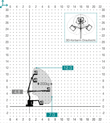 | 3D-Korbarm mit 2x 70° Schwenkwinkel, schmales Gerät. |