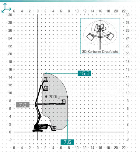 | 3D-Korbarm mit 2x 70° Schwenkwinkel, nur 1,50m breites Gerät |