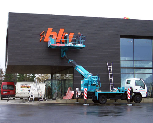 So können auch die größten Zeichen/Buchstaben ohne Verrenkungen und mit Reichweite montiert werden, wie hier bei Fa. Blum, HF.